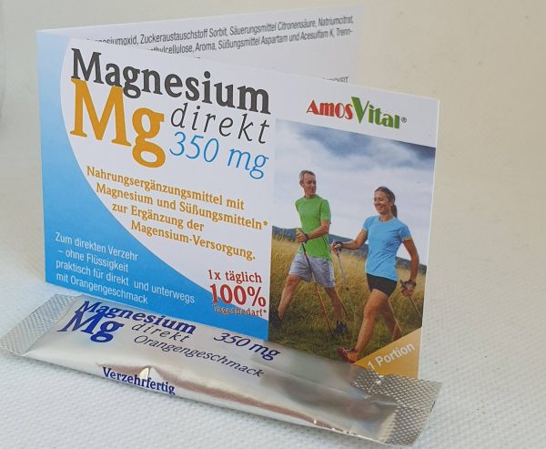 200 Proben AMOSVITAL Magnesium direkt 350g – Portionsbeutel ist ein Nahrungsergänzungsmittel ohne Zuckerzusatz mit Süßungsmitteln.